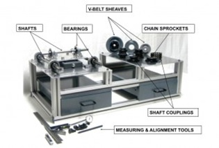 The training system consists of a tabletop mounting and component storage platform with separate component mounting spaces for a driver and driven machine. Standard hand tools (not supplied) are required for drive system assembly and disassembly.